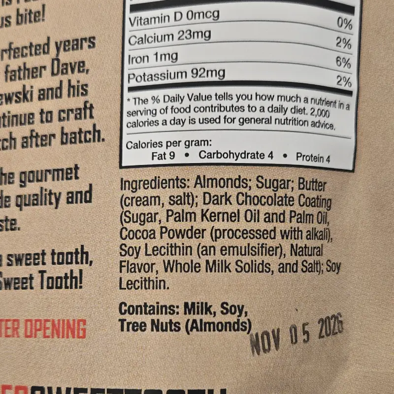 Dave’s most consistent marketing claims are that the toffee has no preservatives and is gluten-free. Both appear to be accurate. The core ingredient list across the flagship flavors reads like a short-form pantry: butter (milk, salt), sugar, almonds, and then whatever chocolate or flavoring applies. Compared to mass-market candy brands layering in artificial flavors, corn syrup, and stabilizers, Dave’s is legitimately cleaner.